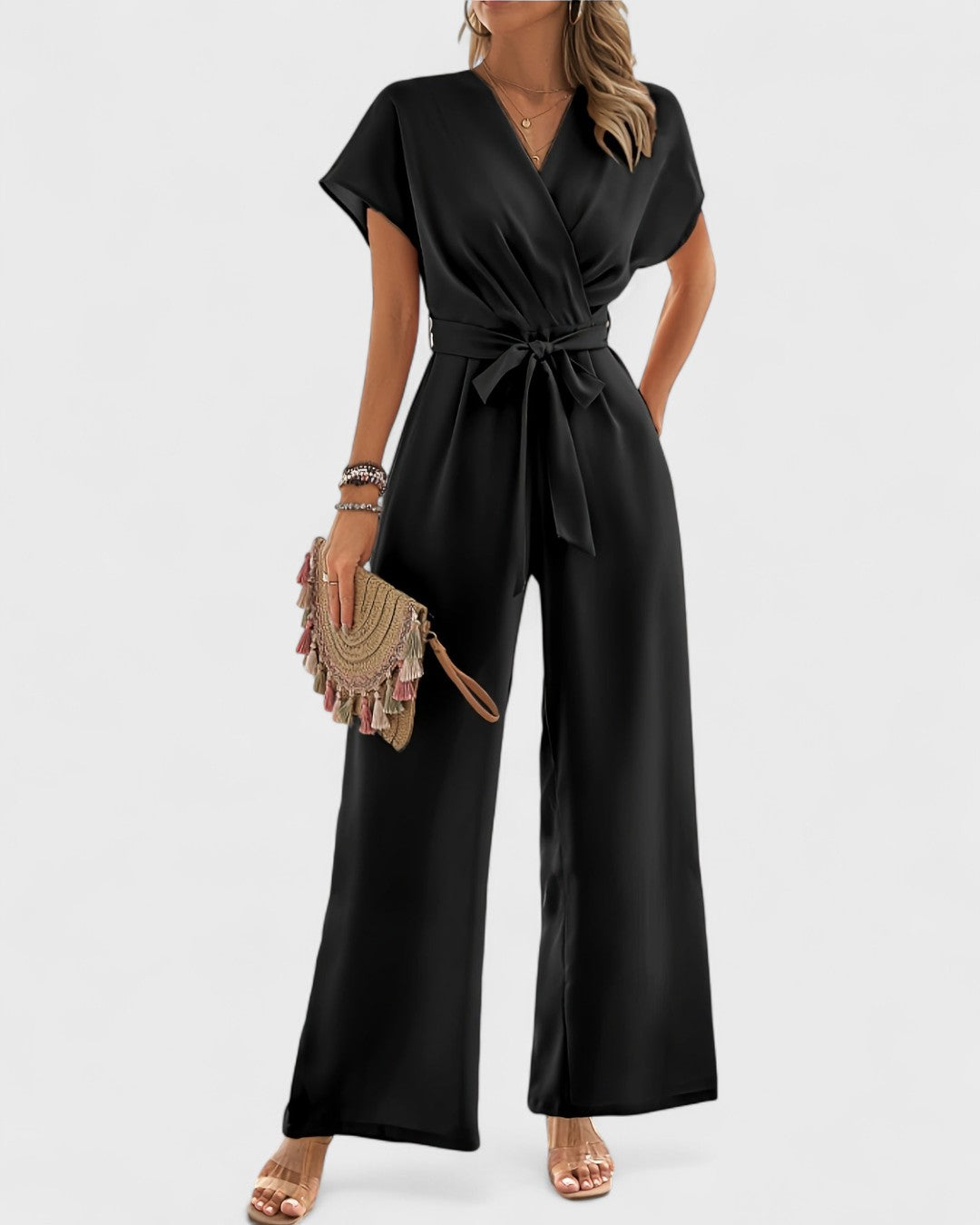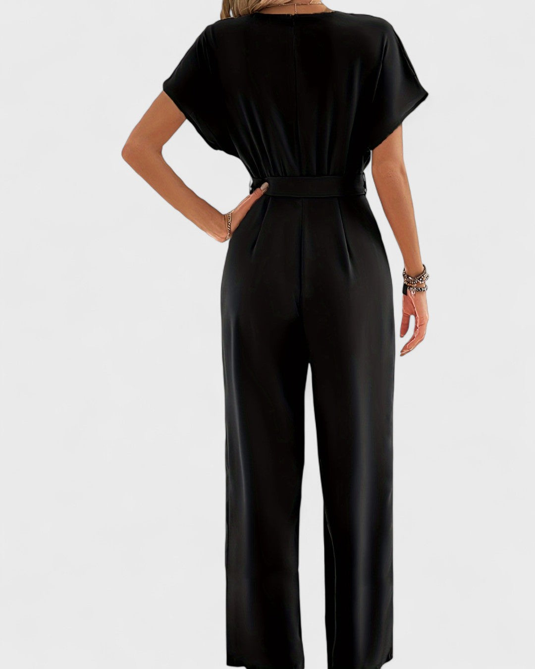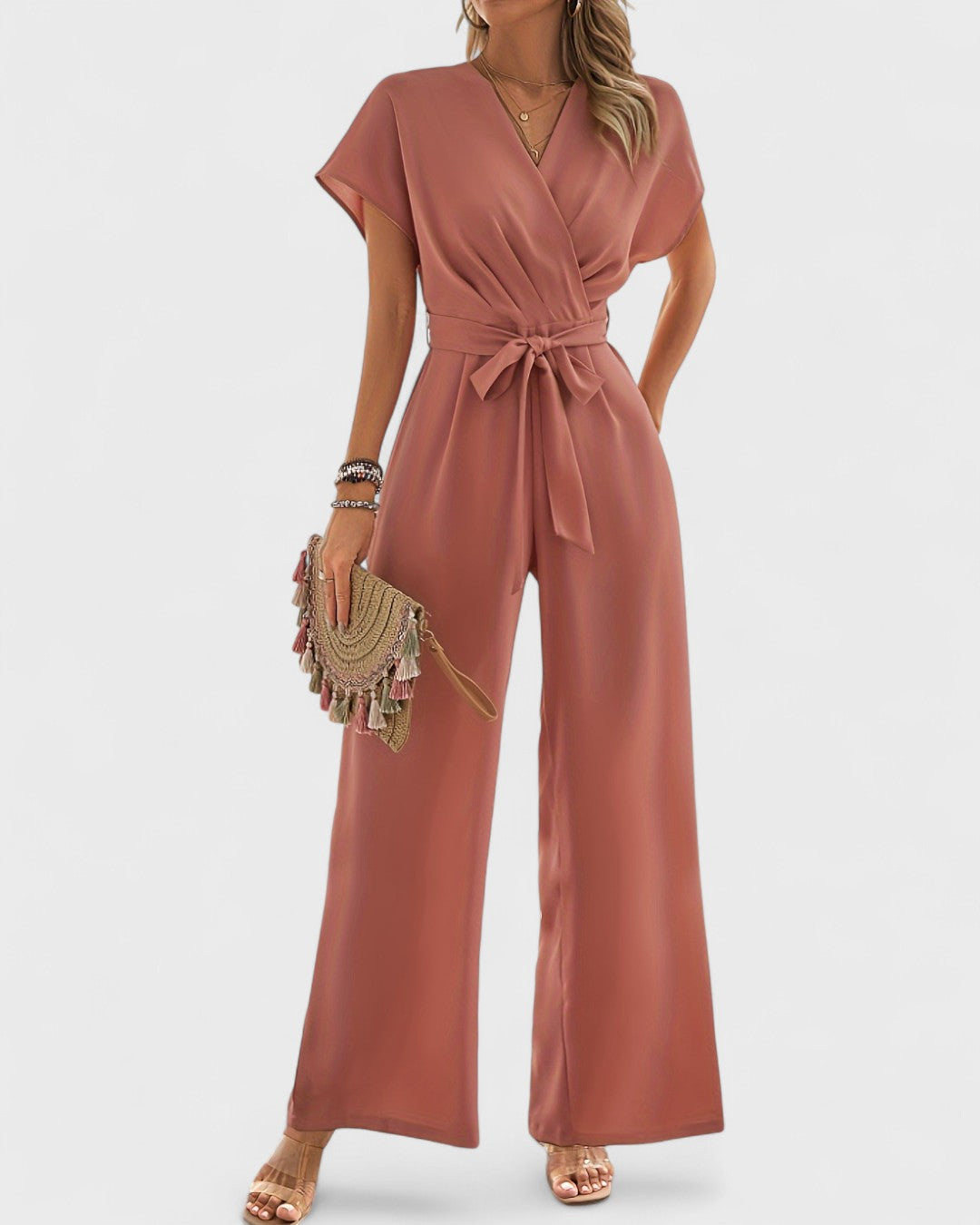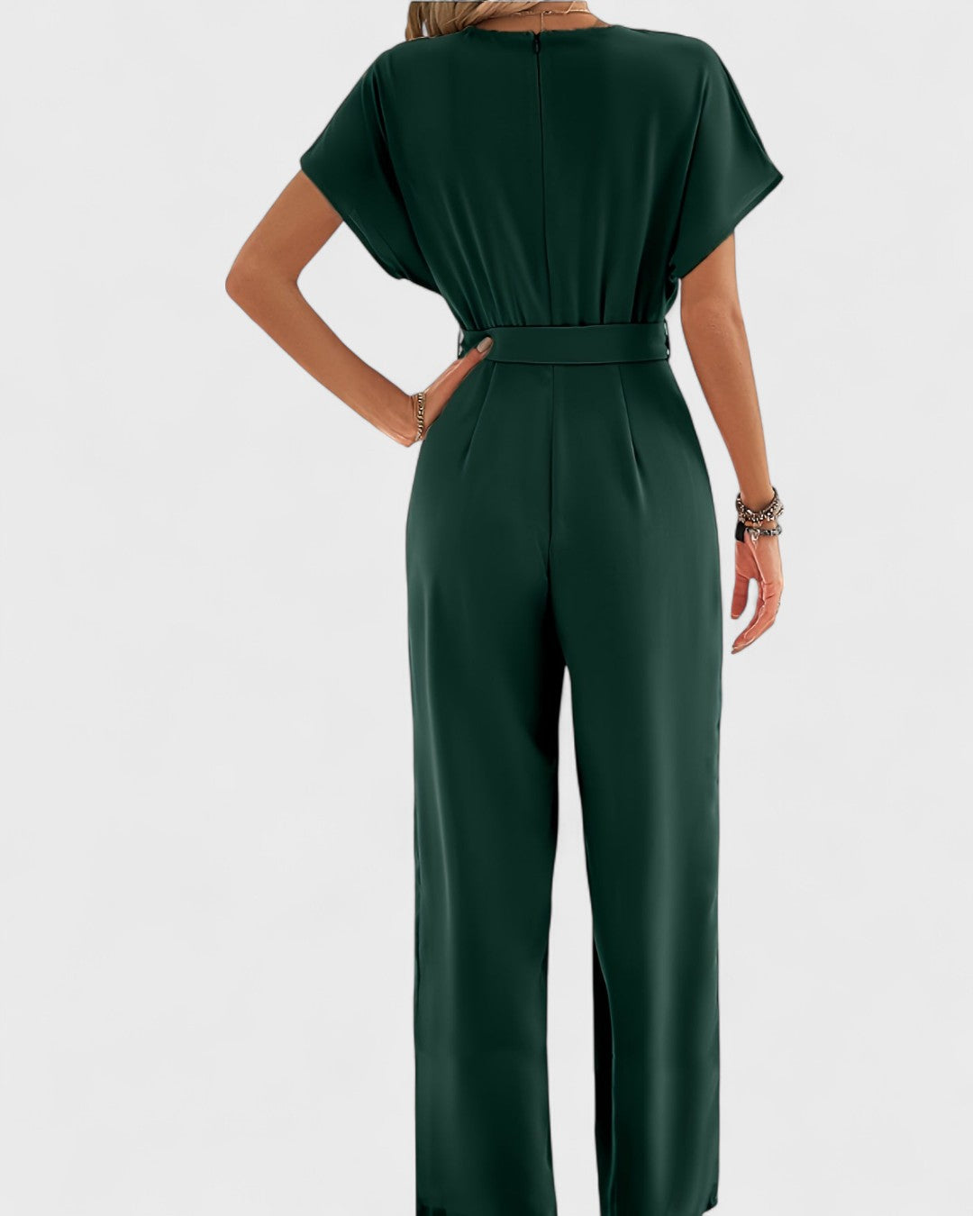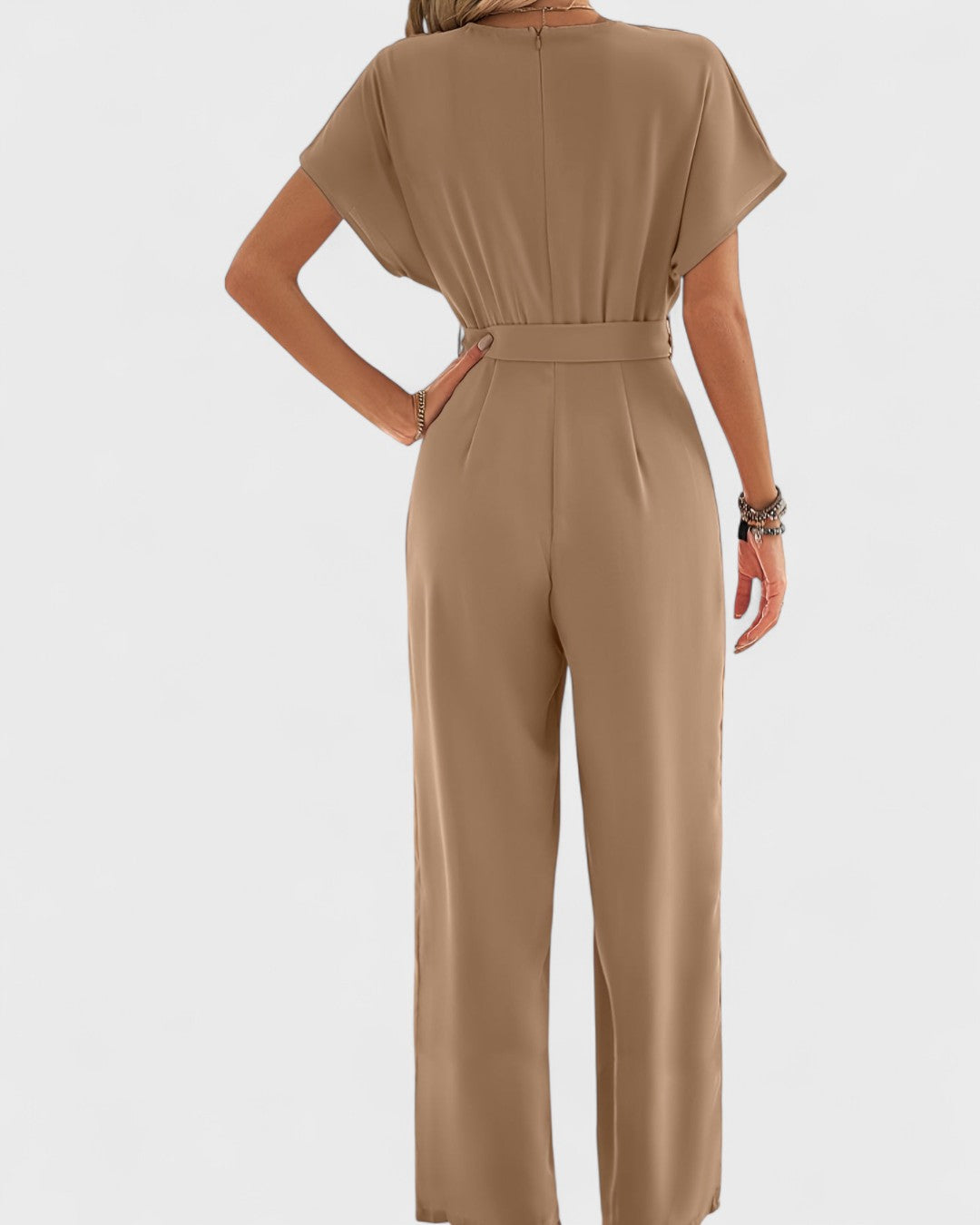 Légère et fluide, cette combinaison à manches courtes est confectionnée dans un polyester doux au toucher, choisi pour sa tenue impeccable et sa facilité d’entretien. Chaque détail — de l’encolure croisée à la taille ceinturée — est pensé pour allier silhouette flatteuse et aisance au quotidien.