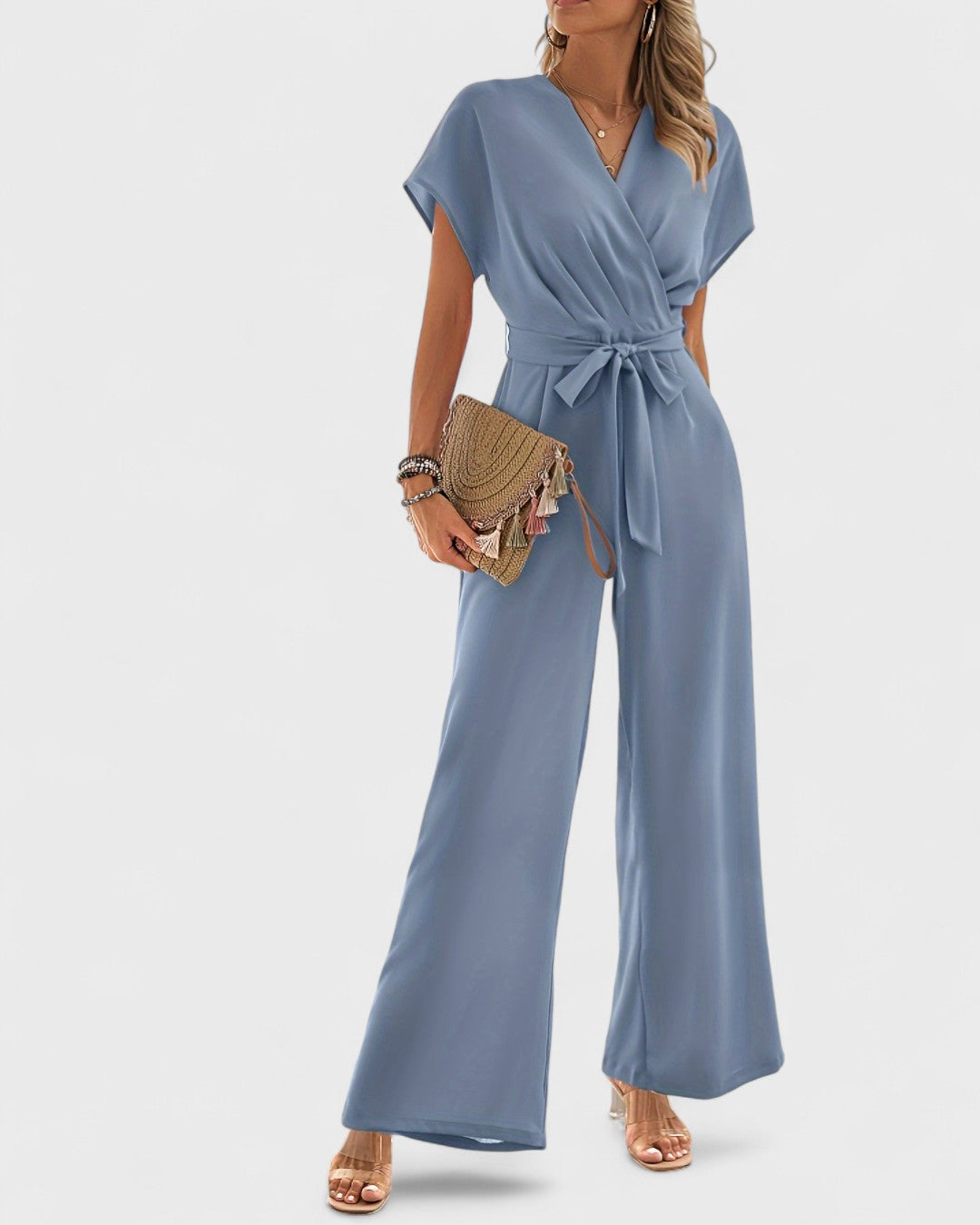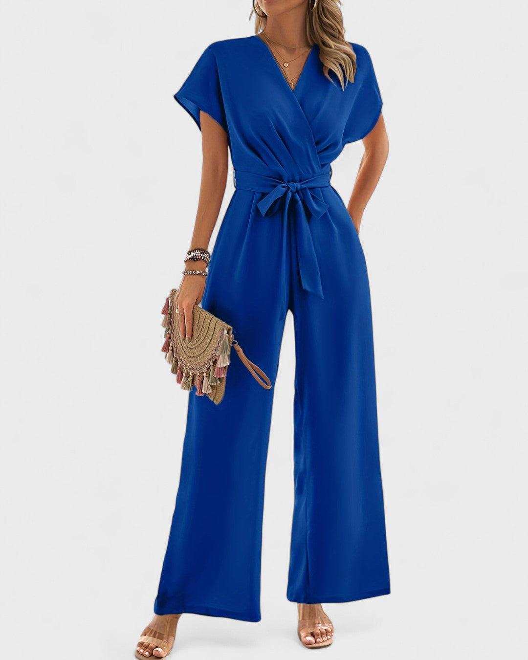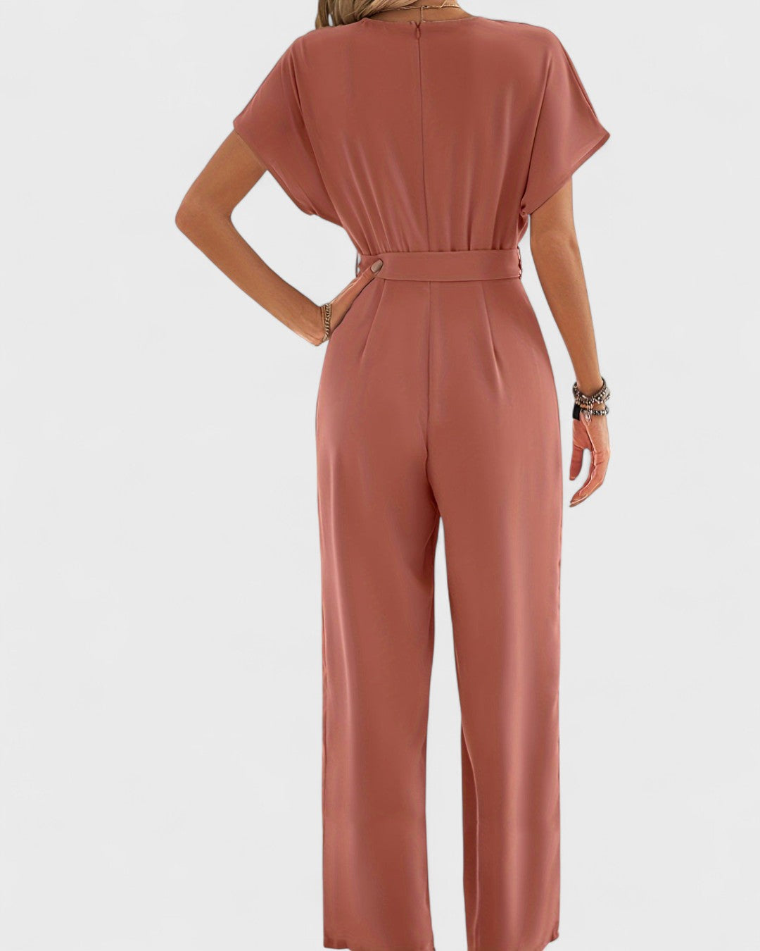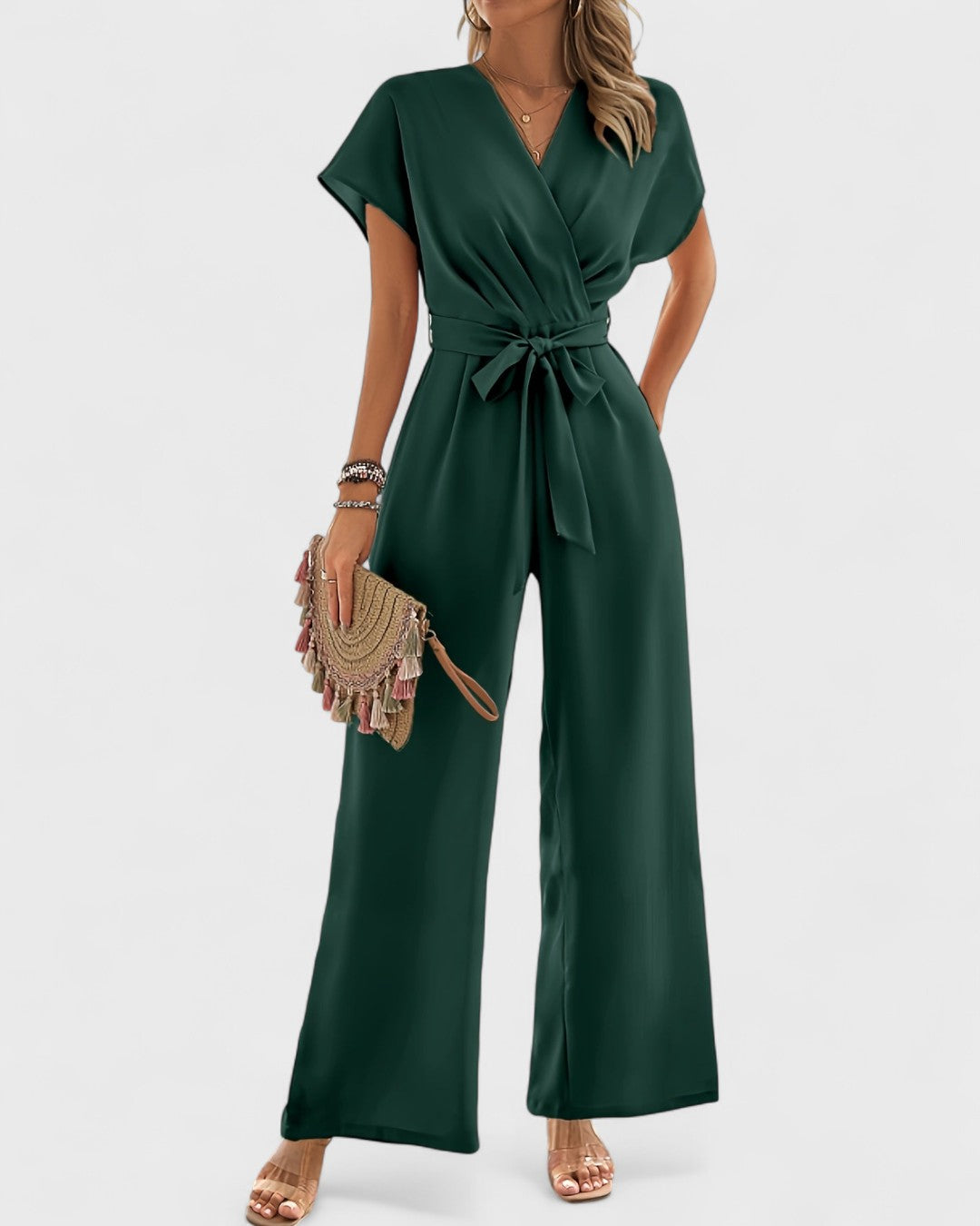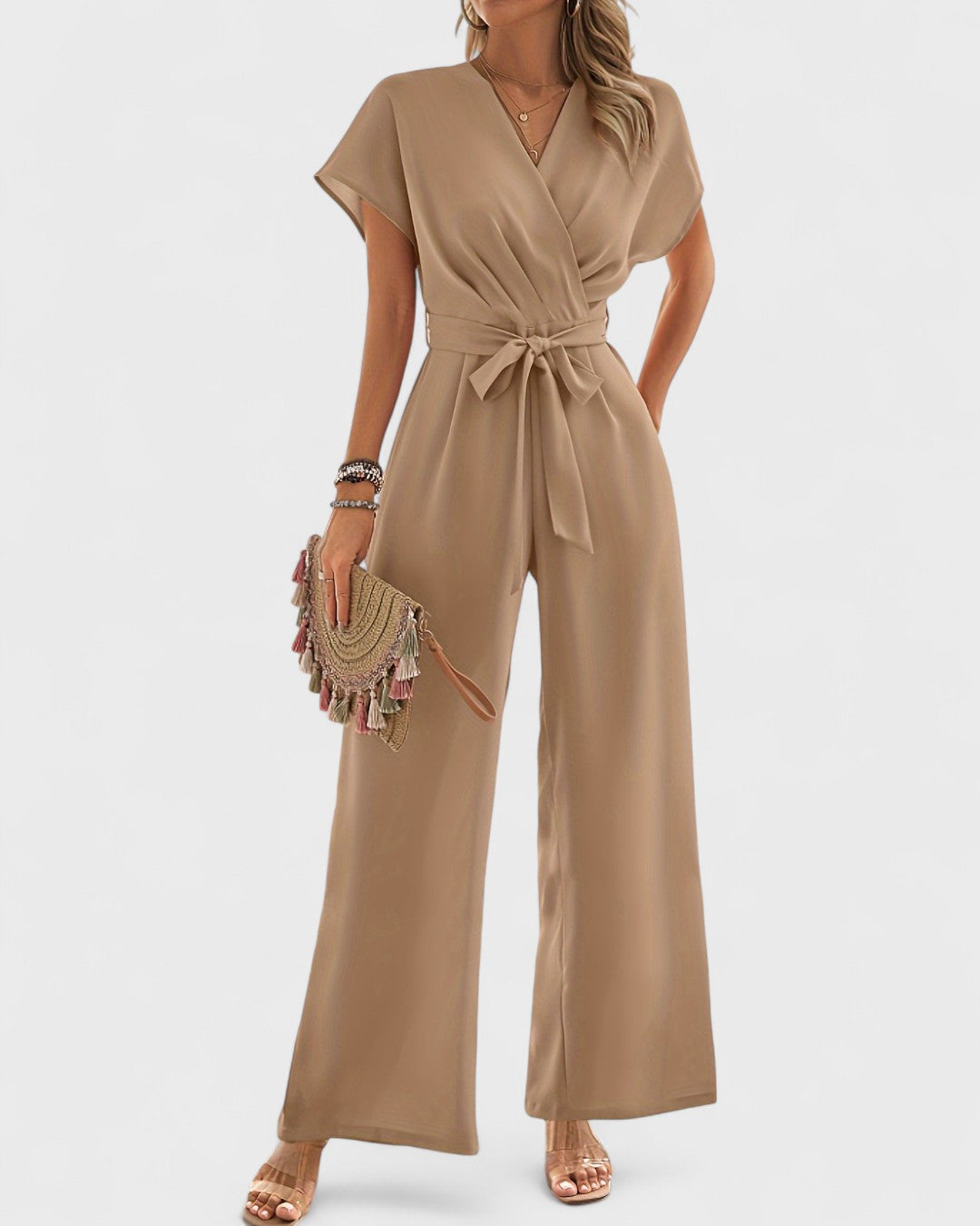 Légère et fluide, cette combinaison à manches courtes est confectionnée dans un polyester doux au toucher, choisi pour sa tenue impeccable et sa facilité d’entretien. Chaque détail — de l’encolure croisée à la taille ceinturée — est pensé pour allier silhouette flatteuse et aisance au quotidien.