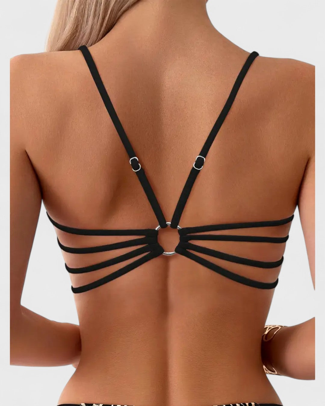 Le jeu de bretelles multiples rassemblées par un anneau métallique attire tous les regards, créant un effet moderne et raffiné.