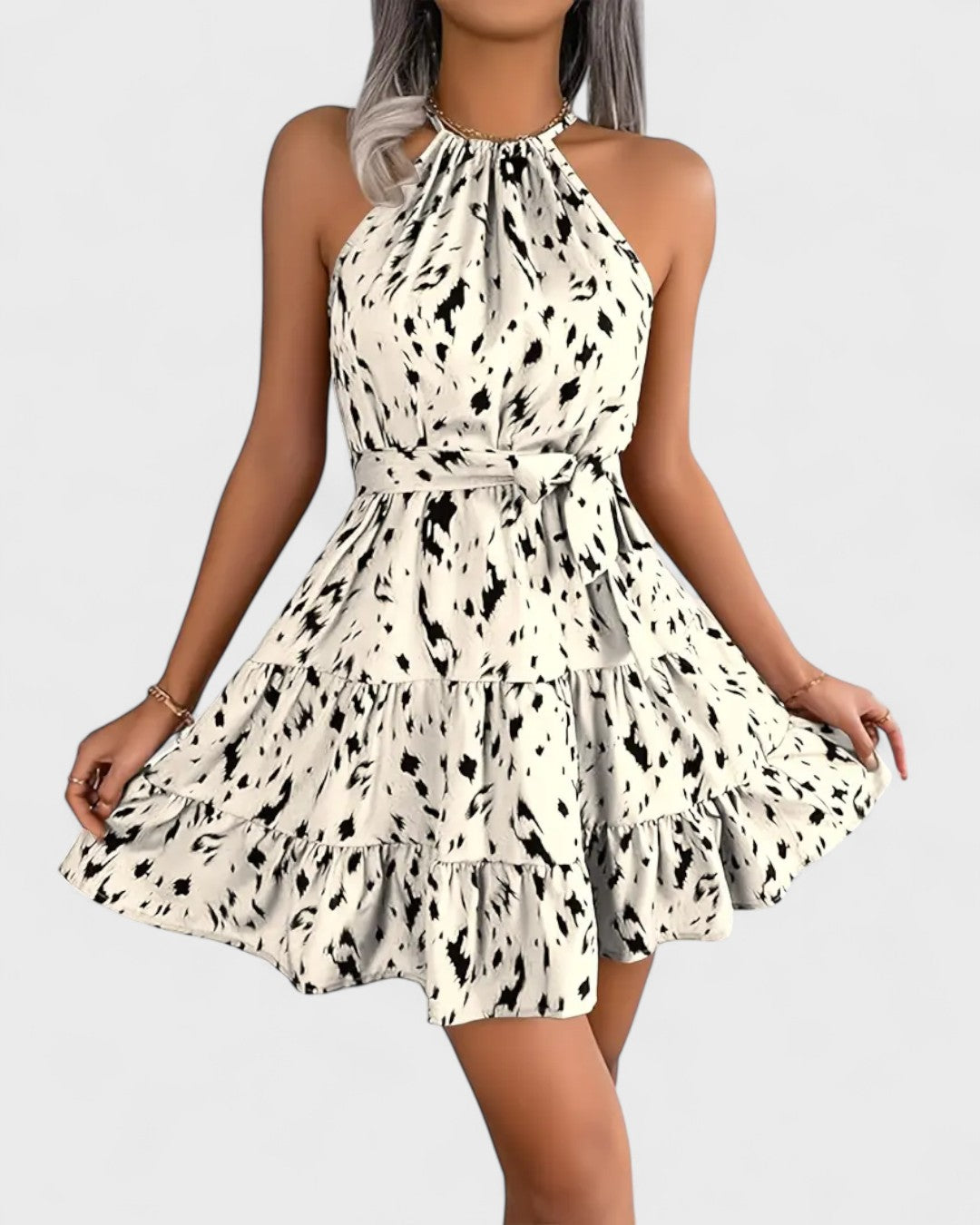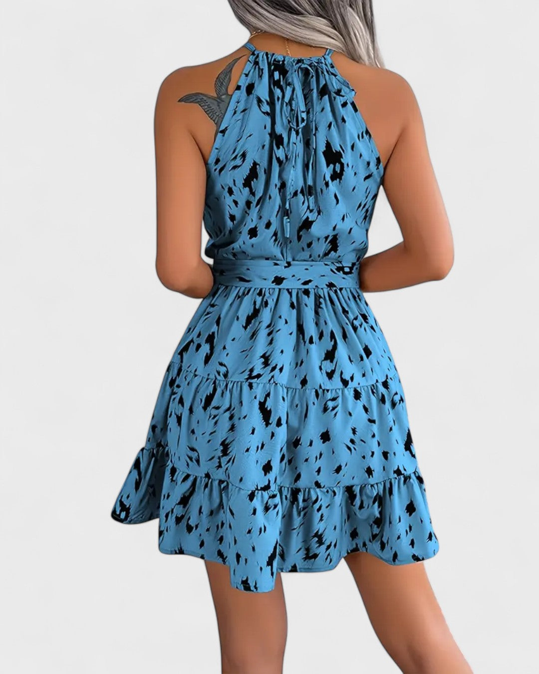 La robe trapèze, née dans les années 1950, a révolutionné la garde-robe féminine par sa coupe fluide et libératrice. Ici, elle est modernisée par un col noué dos-nu et une touche de fantaisie sauvage, pour une allure fraîche mais affirmée.
